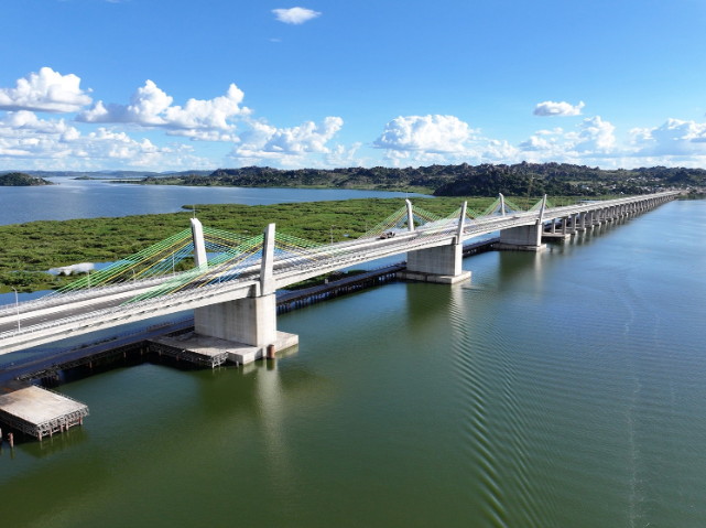馬古富力大橋全長4.66公里,設雙向4車道,設計時速120公里。其主橋為520米三塔雙索面矮塔斜拉橋,主梁共123個節段,采用掛籃懸臂澆筑施工。大橋連接坦桑尼亞北部姆萬扎省的米松桂與森各拉瑪地區,將原有2個多小時的繞行或40分鐘的渡船時間大幅縮短至5分鐘左右,使兩岸貨物運輸成本降低10%至15%,從而增強當地各類產業的競爭力,并憑借其交通樞紐的輻射效應,帶動周邊農業、旅游、商貿等產業蓬勃發展,惠及湖區百萬民眾。